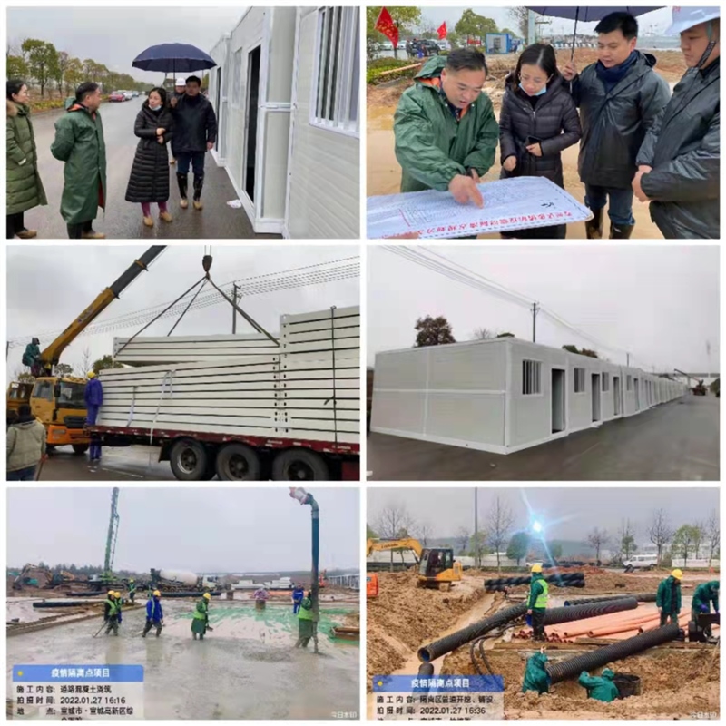 1月27日下午,宣州區政府副區長范瀟瀟到疫情防控臨時隔離點施工現場,查看工程施工進展情況,并充分肯定了項目施工進展速度。截止晚上18:00,疫情防控臨時隔離點項目集裝箱板房材料到場180多套,完成160套集裝箱板房拼裝;炷恋缆贰⒂晡鬯艿篮臀鬯幚碓O施同步進行。面對即將到來的低溫雨雪冰凍天氣,區國資集團積極組織協調各項施工安排,施工人員全體上下團結一心,以堅決態度克服難關,全力推進,高質量完成項目建設。
