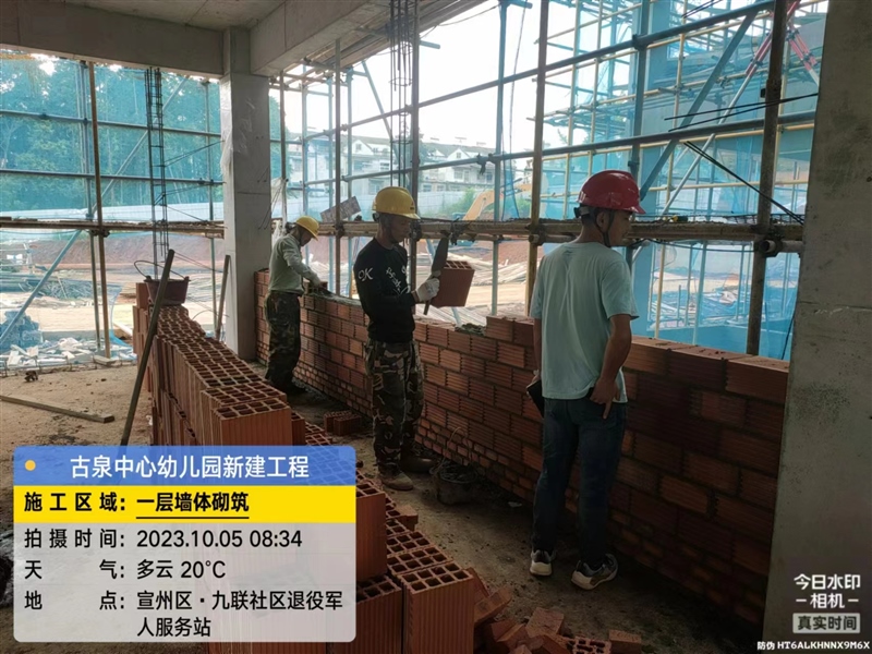 在宣州區古泉中心幼兒園項目,為了保障明年秋季招生,施工隊伍正在對一層墻體進行砌筑。