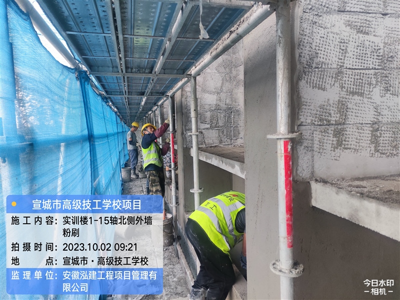 在高級技工學校項目上,為保證學校按時開學招生,施工隊伍正在進行墻面粉刷及墻面保溫施工。
